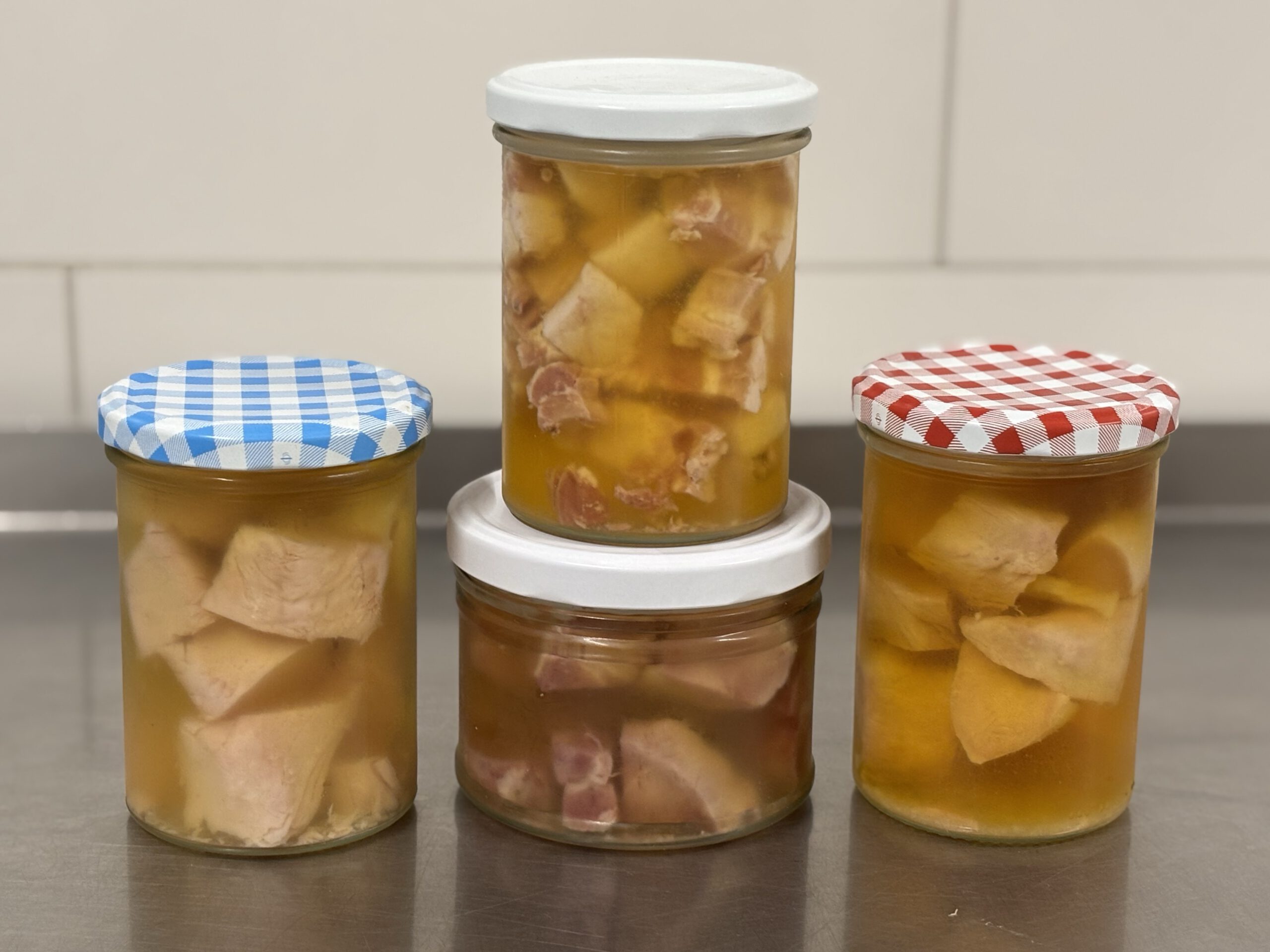 Wir stellen eine vielfältige Auswahl an Gläserware her, darunter Sauerfleisch vom Schwein, Pute und Hähnchen. Außerdem bieten wir verschiedene Sorten Leberwurst an, zum Beispiel Ente und Wild. Vom Schwein mit Cranberry oder Bratapfel/ Zimt , aber auch ganz klassisch die grobe und feine Leberwurst – für jeden Geschmack das Passende. Ergänzt wird unser Sortiment durch Blutwurst, Presskopf und Hamburger Gekochte. Alle unsere Produkte werden sorgfältig nach traditionellen Rezepten hergestellt und in Gläsern abgefüllt, sodass Sie die Frische und Qualität jederzeit genießen können.