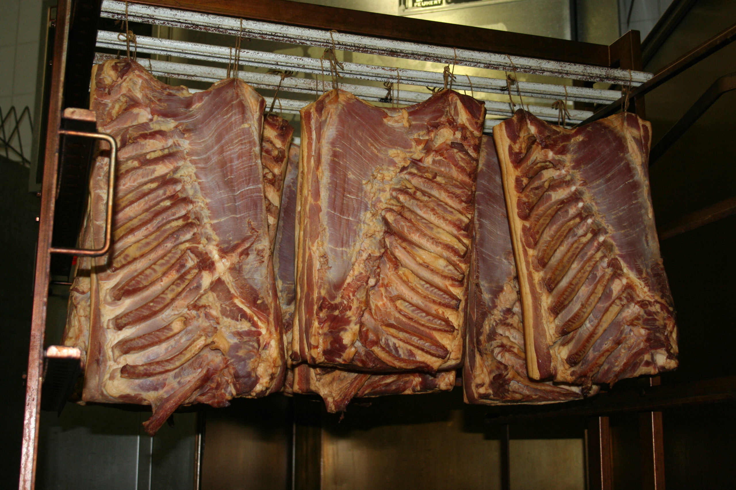 Wir stellen unsere Räucherware, wie Schinken und Mettwurst, in eigener Naturräucherei her. Dabei verwenden wir ausschließlich Buchenspäne, um den einzigartigen Geschmack zu erzielen. Die Herstellung eines Schinkens dauert etwa drei Monate. Zunächst wird er von Hand mit einer speziellen Kräutermischung gesalzen, um das Aroma zu verfeinern. Anschließend ruht er eine gewisse Zeit in der Salzlake, damit er richtig durchziehen kann. Danach hängt er in unserem Rauch, wo er langsam und schonend im natürlichen Buchenrauch reift. So entsteht unsere hochwertige Räucherware mit traditionellem Geschmack!